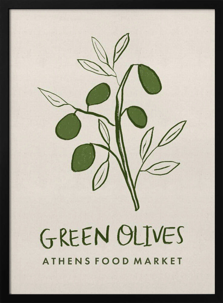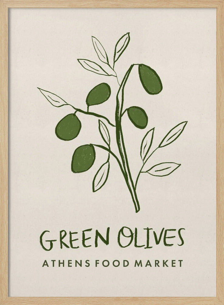 Capture the rich flavours of Greece with this Green Olives Athens Food Market poster. Set against a warm beige background, it brings a touch of Mediterranean charm to any space. Perfect for food lovers and cultural enthusiasts, this art print adds vibrant character and a sense of place to your home or kitchen décor.