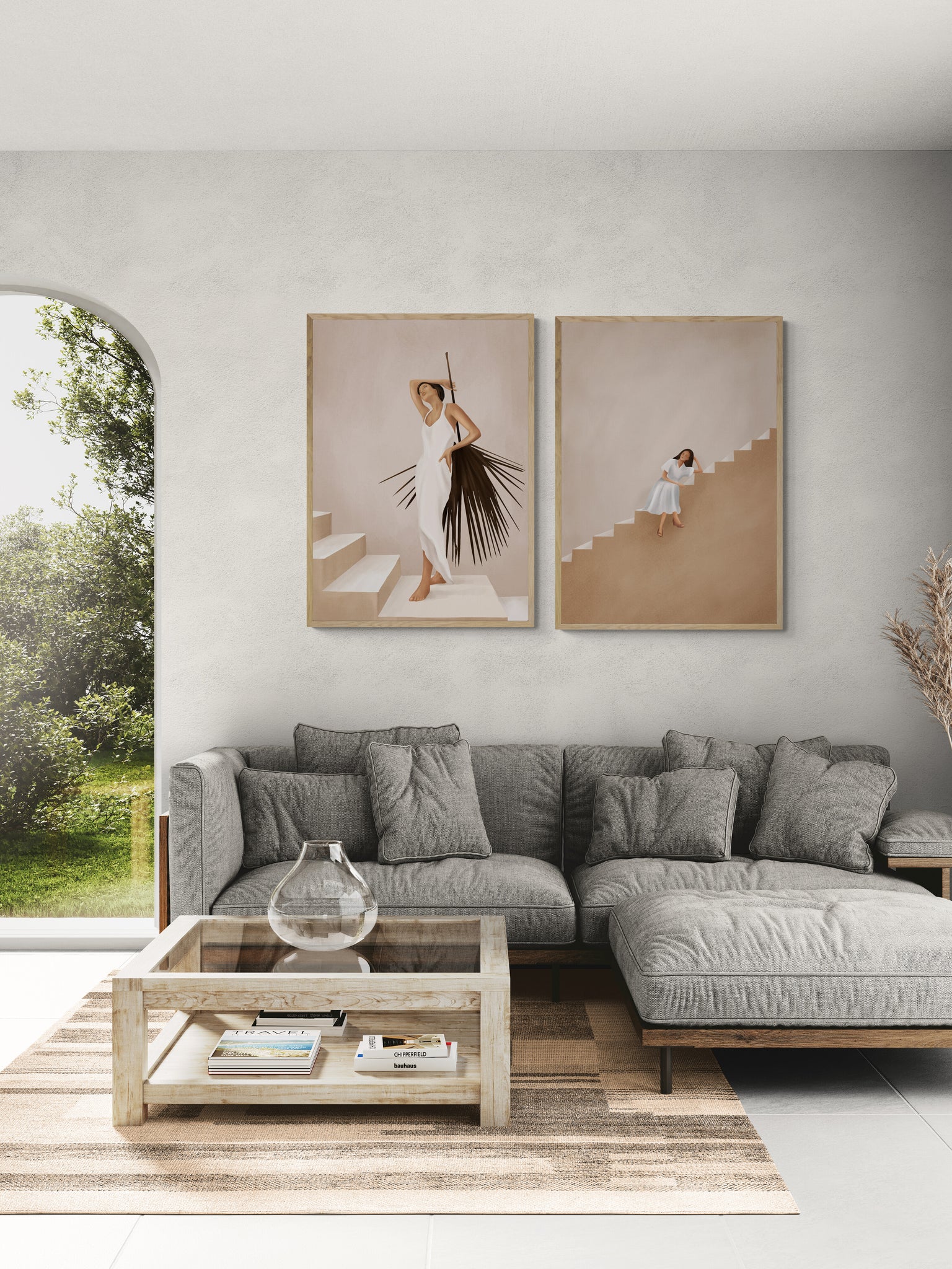 This elegant art print captures a serene moment of a lady in a white dress thoughtfully poised on a staircase. Rendered in soft beige tones, it adds a subtle yet sophisticated touch to any room. Perfect for creating a calm, reflective atmosphere, this piece invites contemplation and enhances your space with timeless beauty.