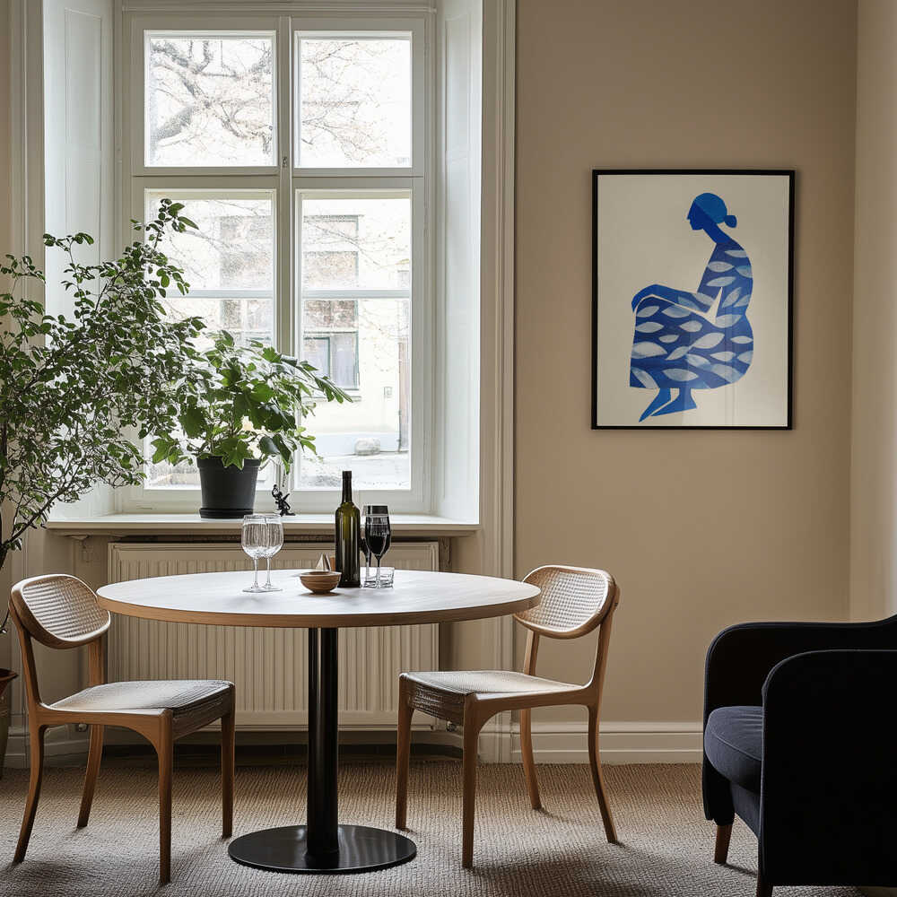 Celebrate the beauty of nature with this captivating art print featuring a serene woman adorned in a flowing blue dress embellished with delicate leaf motifs. Set against a warm, neutral beige background, the composition creates a harmonious balance between elegance and organic charm. Perfect for adding sophistication to any room, this piece invites contemplation and brings a touch of botanical grace to your walls. An ideal choice for nature lovers and art enthusiasts seeking meaningful décor that speaks to the soul.