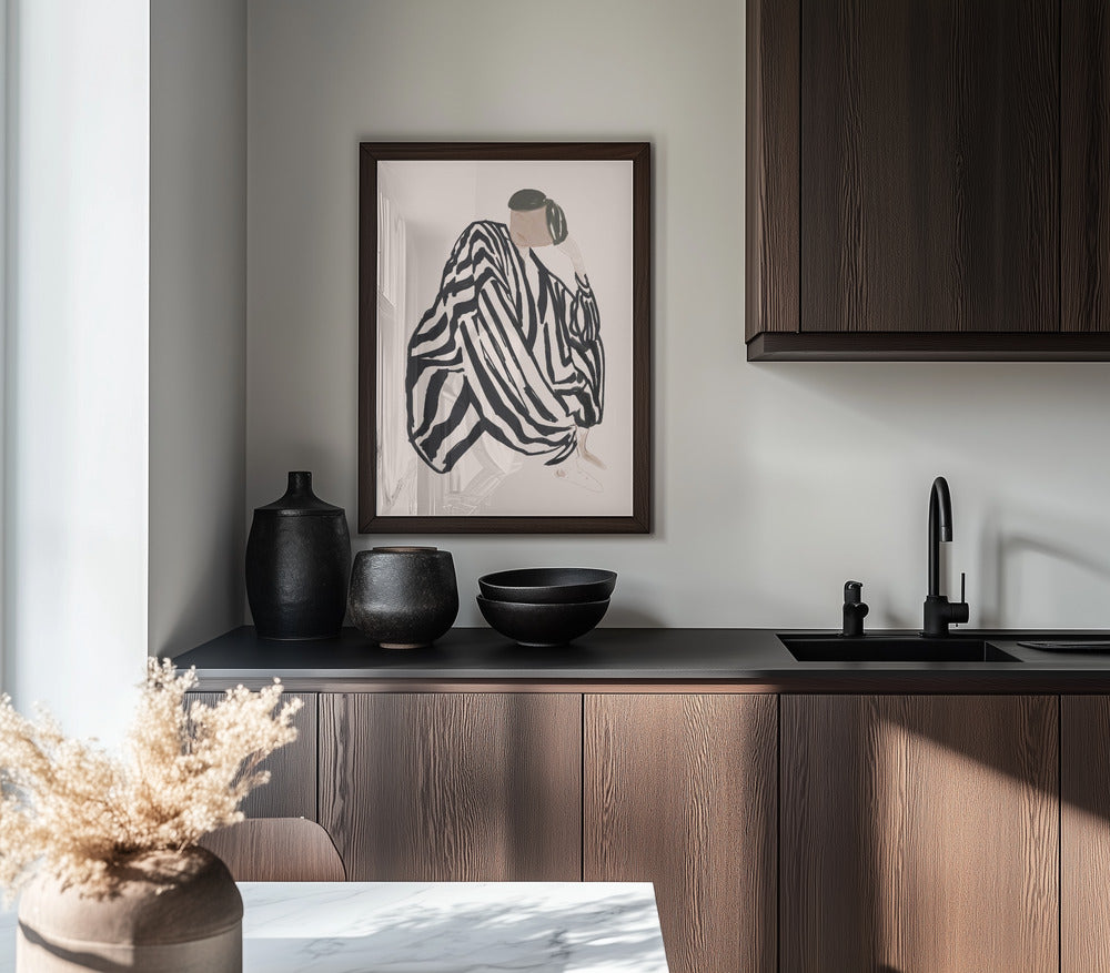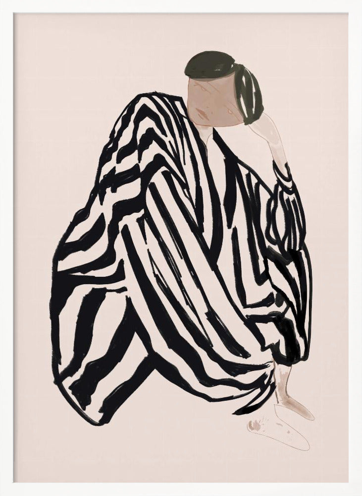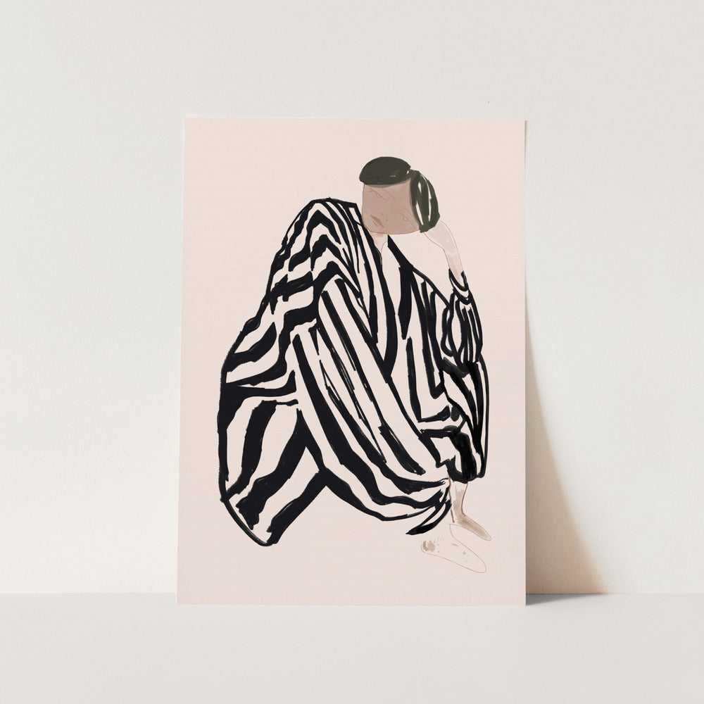 Elevate your space with this striking Female Figure 3 PFY Art Print. The captivating design features a female figure dressed in black stripes in a seated pose, creating a bold visual statement. Part of an exclusive three-print collection, this artwork adds sophistication and contemporary flair to any room. Perfect for art enthusiasts looking to create a cohesive gallery wall or as a standalone statement piece.