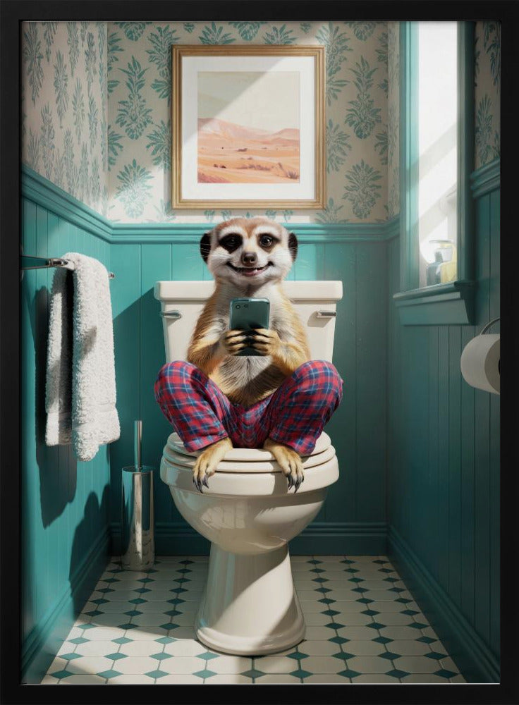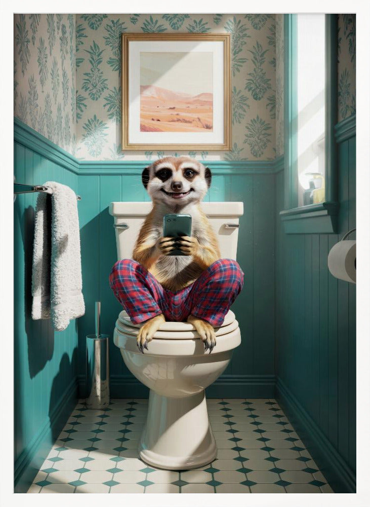 Add a touch of whimsy to your bathroom with the Bathroom Meerkat PFY Art Print. Featuring a charming meerkat in cozy pyjamas, sitting comfortably on a toilet and engrossed in his phone, this playful artwork brings humor and personality to your space. Perfect for brightening up your bathroom walls, itβs a fun conversation starter that combines quirky style with everyday life.Β
