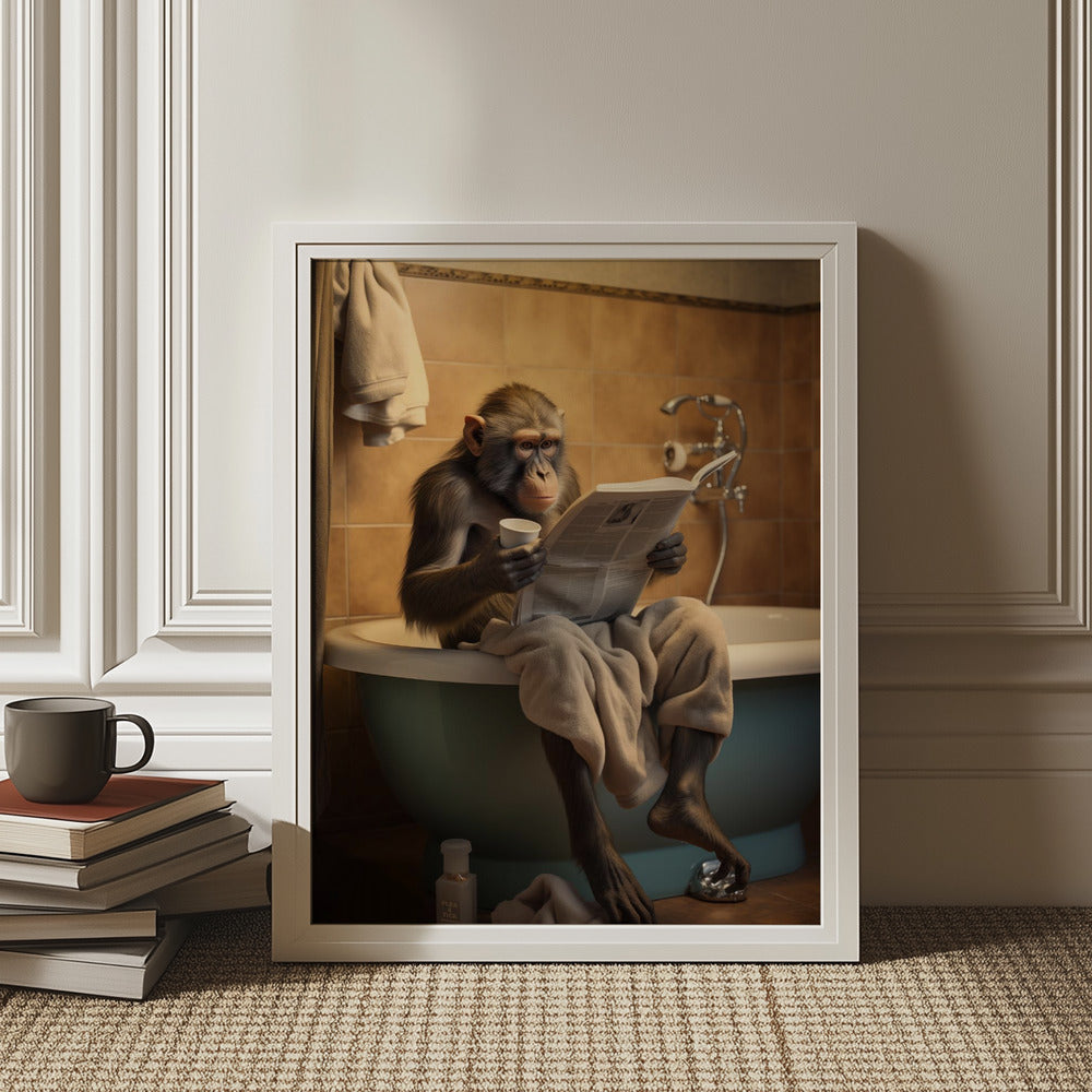 Bring a touch of whimsy to your space with the Monkey In the Bathroom PFY Art Print. This charming artwork captures a playful monkey enjoying a quiet moment, reading a newspaper with a cup of coffee beside it. Perfect for adding character and a lighthearted vibe to any room, this print invites smiles and sparks conversation.