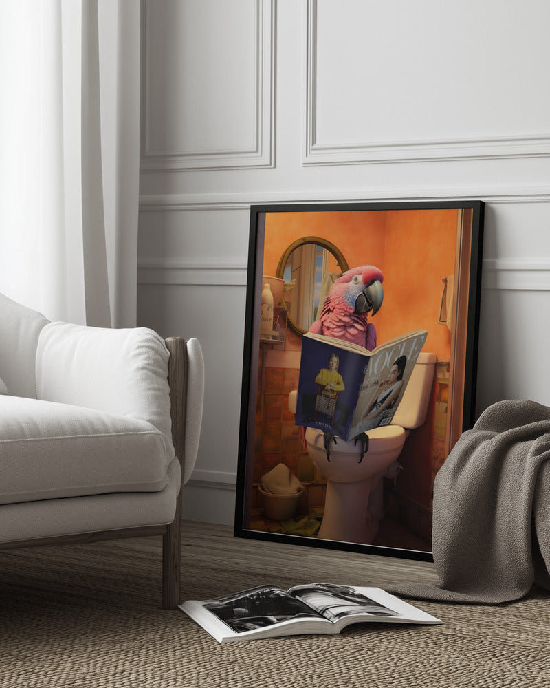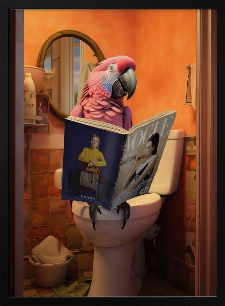 Add a splash of quirky charm to your space with the "Parrot In the Toilet PFY Art Print." This playful artwork features a pink parrot perched comfortably on a toilet, engrossed in a Vogue magazine, blending humor and style effortlessly. Perfect for brightening up any room, it invites smiles and sparks conversation while showcasing your unique taste in art.