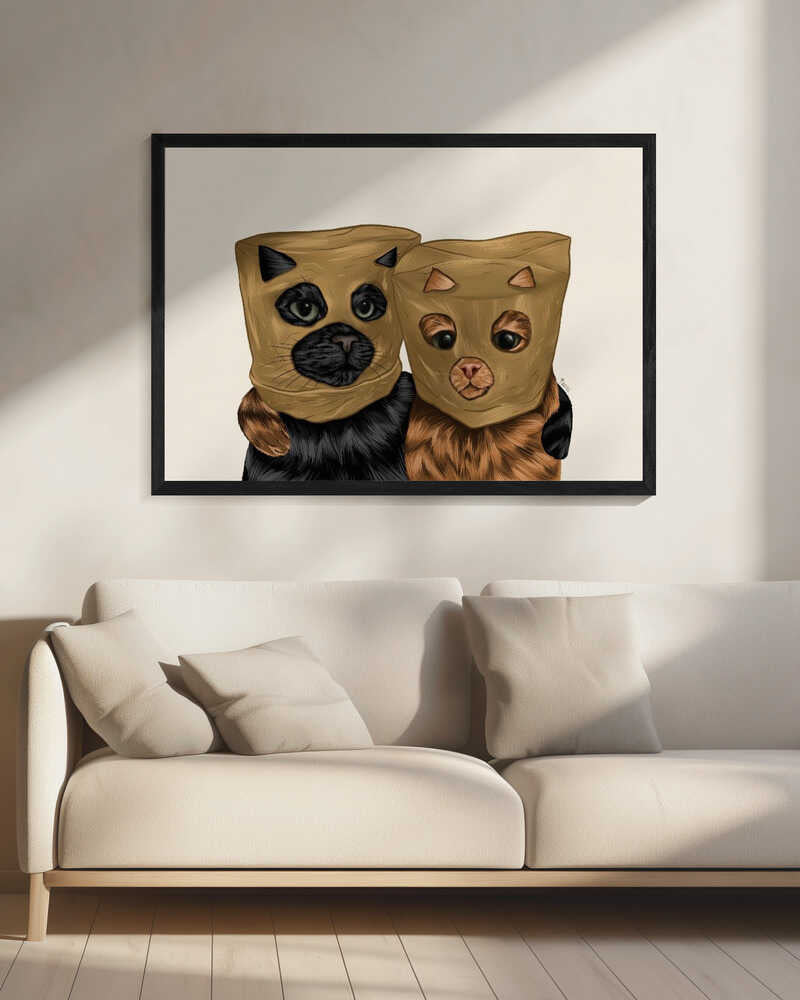 Add a playful touch to your space with the Pawtners in Crime PFY Art Print. This quirky design features mischievous cats wearing bags over their heads, capturing a fun and whimsical moment that’s sure to spark smiles. Perfect for cat lovers and anyone who enjoys a bit of feline humor, this high-quality art print brings character and charm to any room.