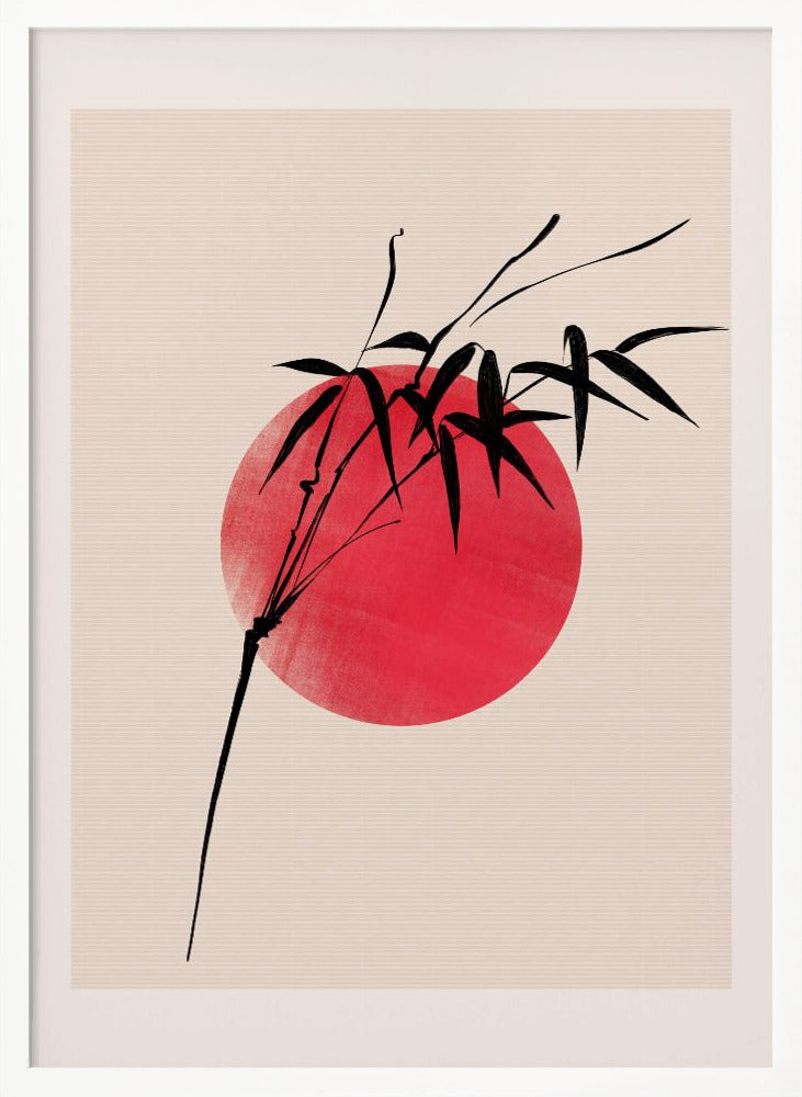 This striking art print features a beige background with a bold black bamboo plant standing in front of a vibrant red sun. Bring the beauty and serenity of nature into your home or office with this unique piece. Perfect for adding a touch of elegance and inspiration to any space.