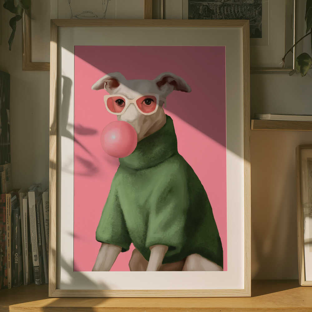 Meet the Bubblegum Pup – a delightfully whimsical art print that brings instant charm to any space. This playful illustration features an adorable dog sporting a vibrant green jersey, caught mid-bubble-blow against a cheerful pink backdrop. Perfect for dog lovers and art enthusiasts alike, this print adds personality and warmth to bedrooms, nurseries, or creative workspaces. The vibrant colour palette and endearing subject matter make it an ideal gift for anyone who appreciates quirky, feel-good artwork.