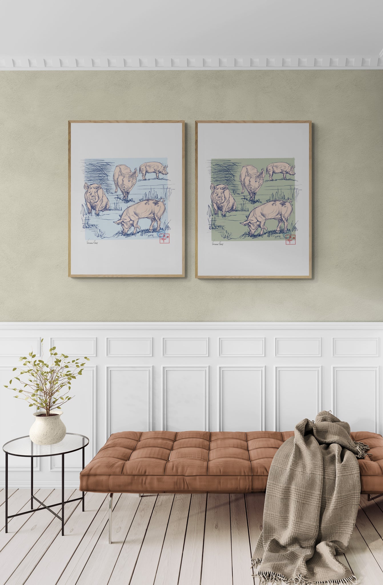 Discover the charm of farmyard elegance with this striking art print featuring graceful line drawings of pigs set against a serene blue background. Perfect for adding character to any space, this piece celebrates the beauty found in simple, flowing lines and natural forms. Whether you're a farm enthusiast, animal lover, or appreciate minimalist art, this print brings warmth and whimsy to your walls. The soft blue backdrop creates a calming atmosphere while the delicate pig illustrations add personality and conversation-starting appeal.