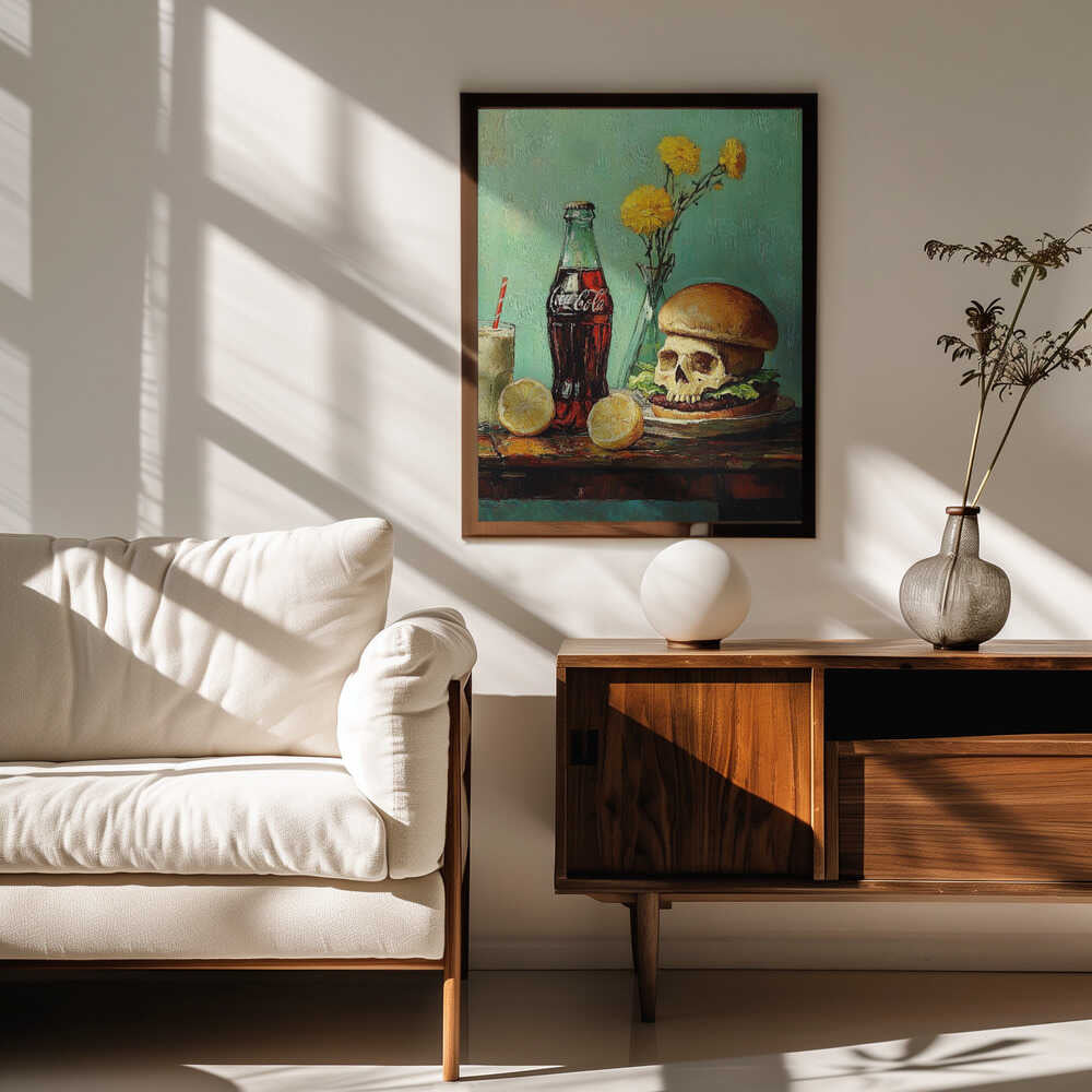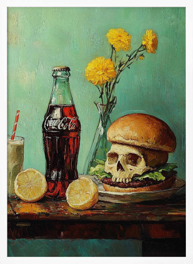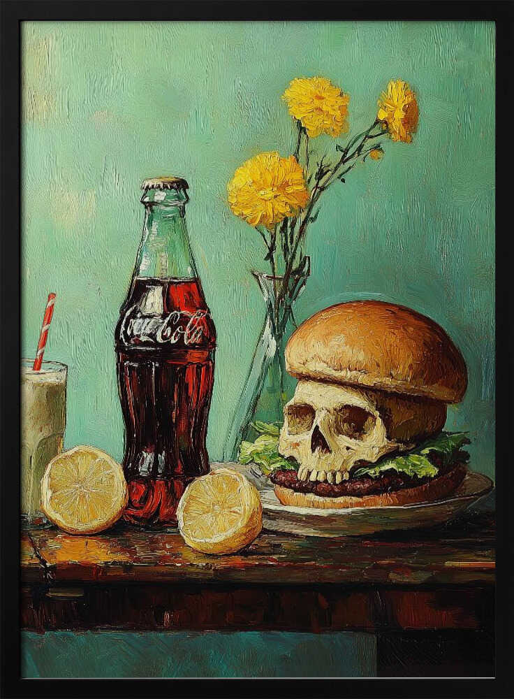 Discover a bold fusion of vintage charm and modern edge with the Eternity and Desire PFY Art Print. Featuring a striking skull, a classic hamburger, and a refreshing coke, this artwork captures a unique blend of timeless motifs and contemporary culture. Perfect for adding an eye-catching statement to any room, it invites conversation and curiosity while enriching your space with captivating style.