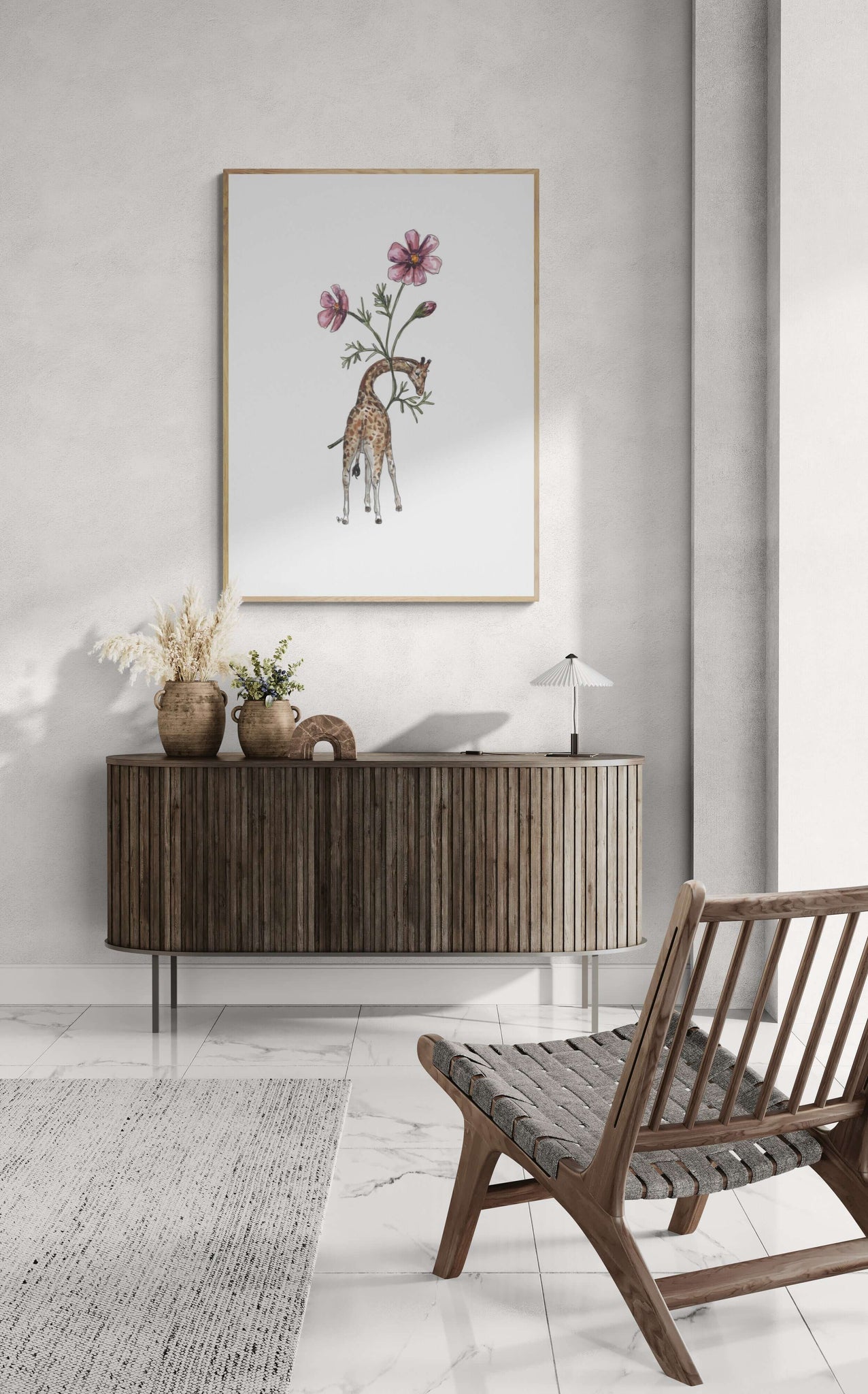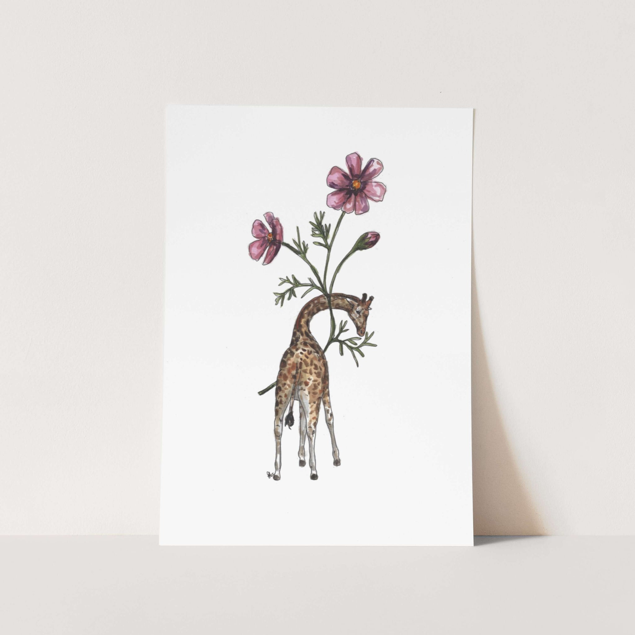 Experience the majestic beauty of the Giraffe in Cosmos Art Print! This stunning illustration features a watercolour giraffe surrounded by vibrant purple cosmos, creating a sense of wonder and serenity. Add a touch of sophistication to any room with this unique and captivating piece.