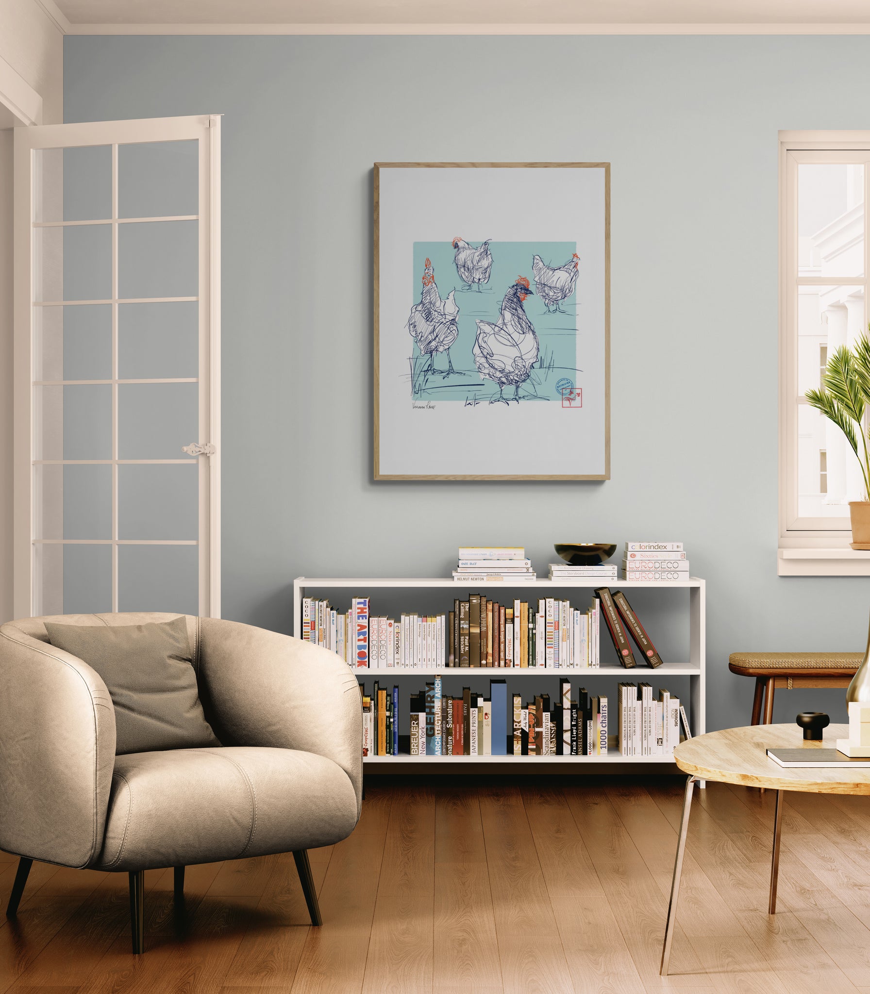 Discover the charm of farmyard elegance with this striking art print featuring delicate blue pen line drawings of chickens set against a serene blue background. The minimalist illustration style brings a touch of rustic sophistication to any space, whether you're decorating a kitchen, farmhouse, or gallery wall. Perfect for poultry enthusiasts and art lovers alike, this piece combines whimsical character with contemporary design. The soft, cohesive color palette creates a calming visual impact that complements both modern and traditional interiors. Elevate your décor with this unique, conversation-starting print that celebrates the simple beauty of country living.
