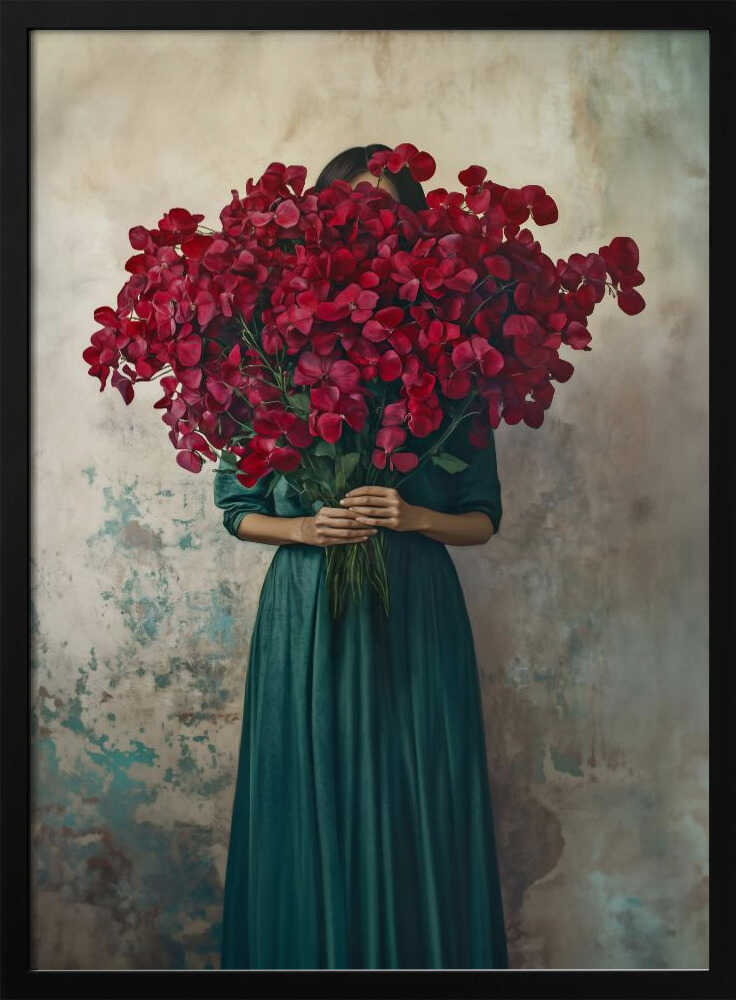 A striking portrait of elegance and vitality—a woman draped in rich emerald green, cradling an abundant bouquet of crimson blooms. This captivating art print celebrates the intersection of natural beauty and refined style, bringing warmth and sophistication to any space. The bold colour contrast between the jewel-toned dress and vibrant red flowers creates visual drama that commands attention. Perfect for those who appreciate art that speaks to passion, grace, and the vibrant energy of life itself. Transform your walls with a piece that radiates confidence and timeless allure.