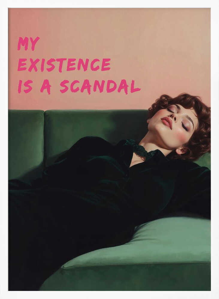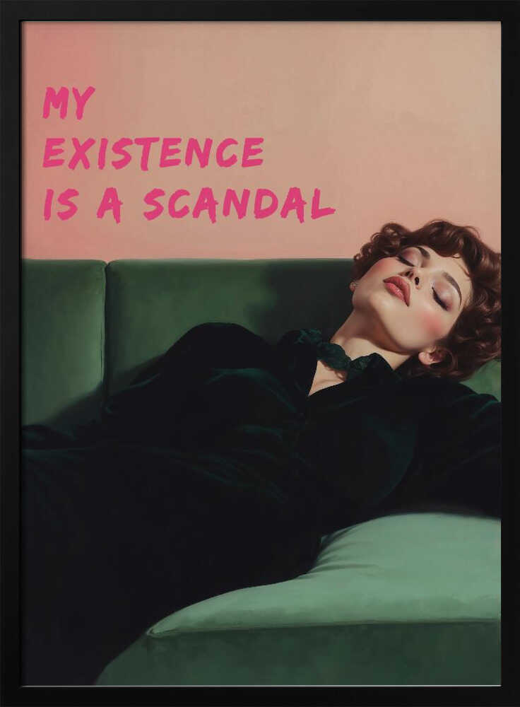 Discover bold artistic expression with this striking vintage-inspired art print featuring a reclining woman on an emerald green couch. The provocative pink text "My existence is a scandal" adds contemporary edge to classic aesthetics, creating a conversation-starting piece perfect for modern interiors. Ideal for galleries, bedrooms, or creative spaces, this PFY Art Print combines retro charm with unapologetic attitude. Make a statement with artwork that challenges conventions and celebrates individuality.