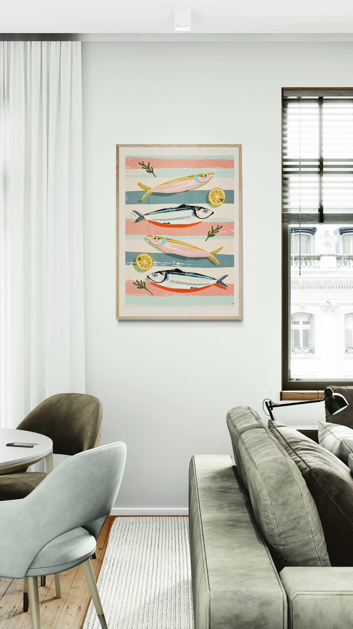 Sardines on Stripes Art Print brings coastal charm and contemporary style to any room. This striking design features vibrant sardines set against bold striped patterns, creating a dynamic visual that captures the essence of seaside living. Perfect for kitchen walls, dining spaces, or anywhere you want to inject personality and colour. The fresh lemon accents add a pop of brightness that complements modern and eclectic interiors alike. Whether you're a seafood enthusiast, art lover, or simply seeking a conversation-starting piece, this print transforms ordinary walls into a gallery-worthy display that celebrates the beauty of simple, everyday subjects elevated to fine art.