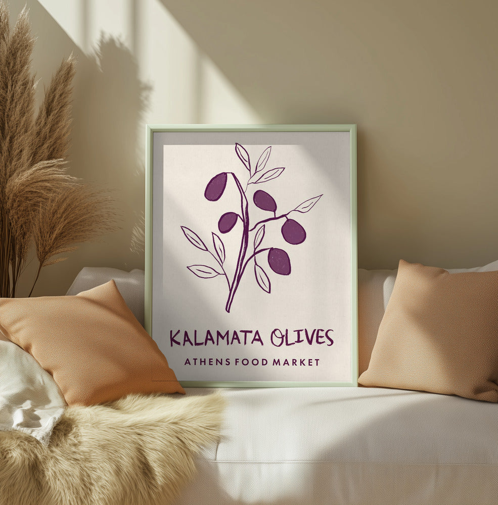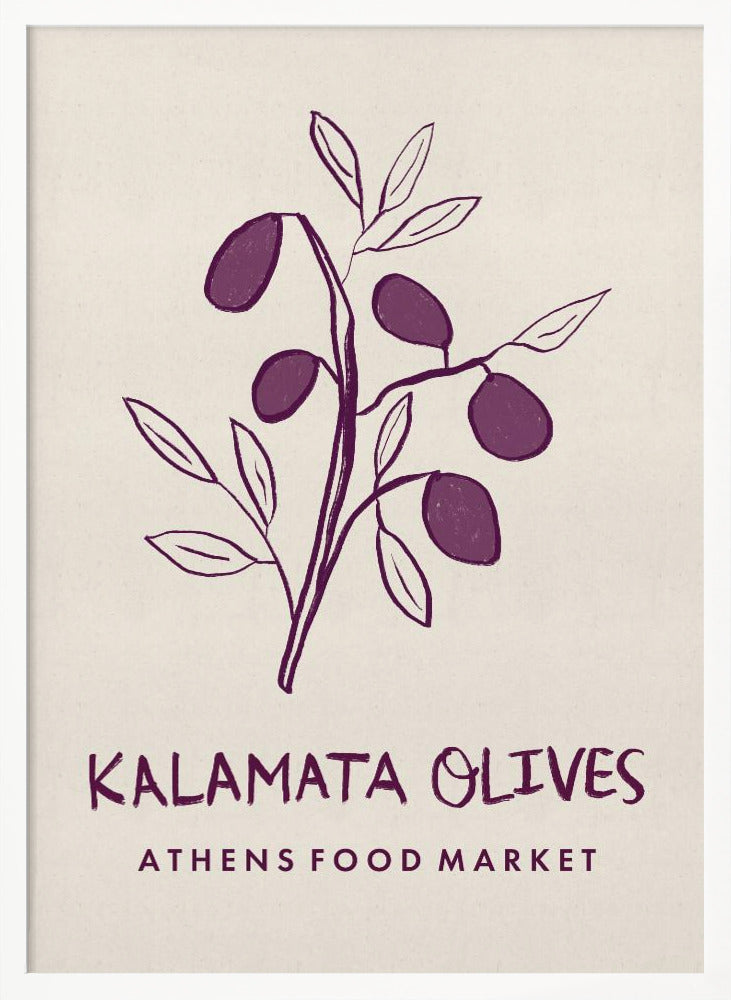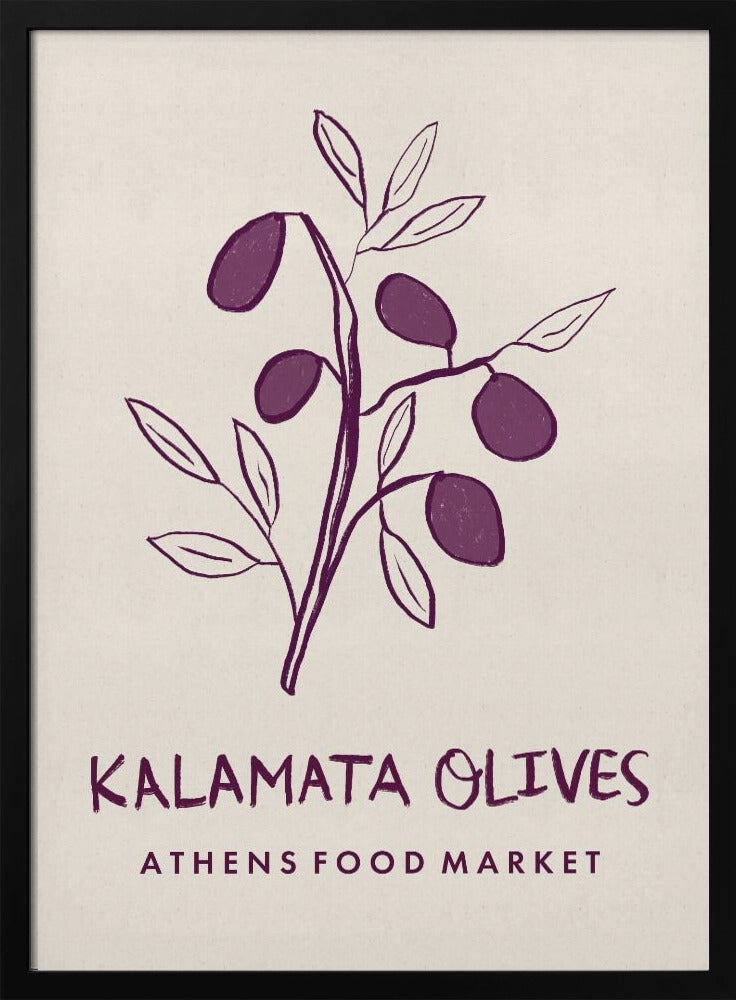 Experience the vibrant spirit of Greece with this Kalamata Olives Athens Food Market art print. Featuring rich purple olives set against a warm beige background, it brings a touch of Mediterranean charm and authentic market life into your space. Perfect for adding color and culture to your kitchen or dining area, this print celebrates the simple beauty of traditional Greek flavours.