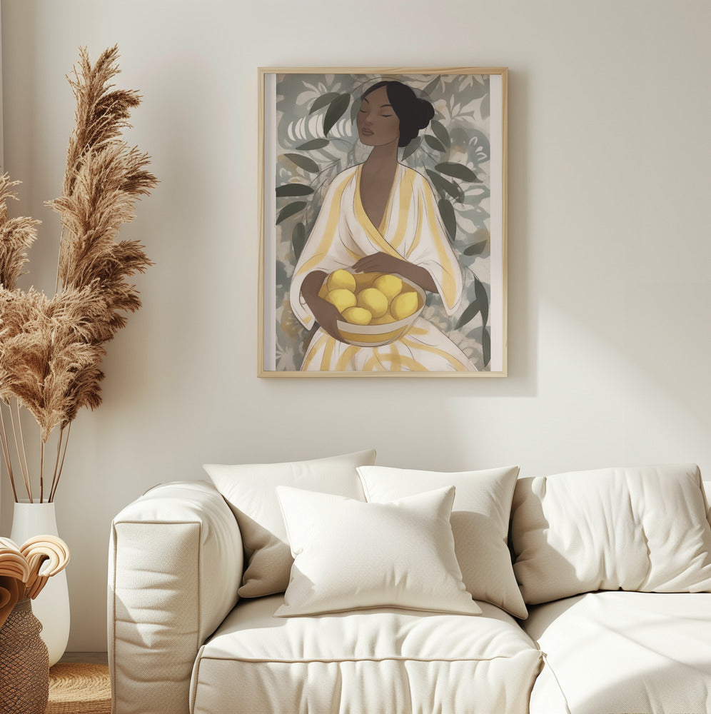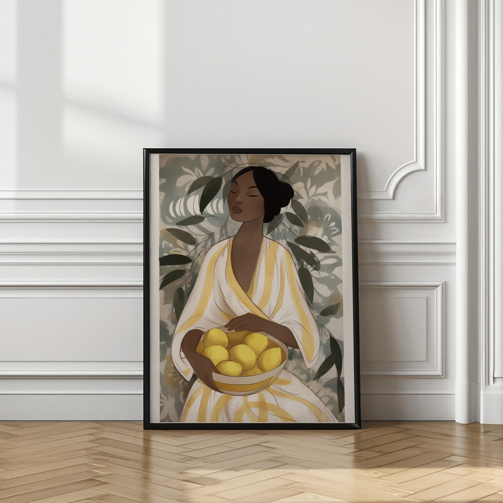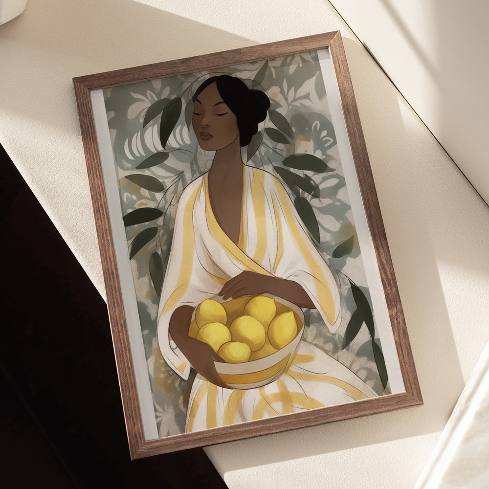 Capture the fresh vibrancy of summer with the Citrus Garden Woman PFY Art Print. Featuring a woman in a flowing yellow dress gently holding a bowl of lemons, set against lush green leaves, this artwork brings warmth and natural beauty into your space. Its vivid colours and serene composition create a refreshing ambiance, perfect for brightening walls and inspiring a sense of calm and joy.