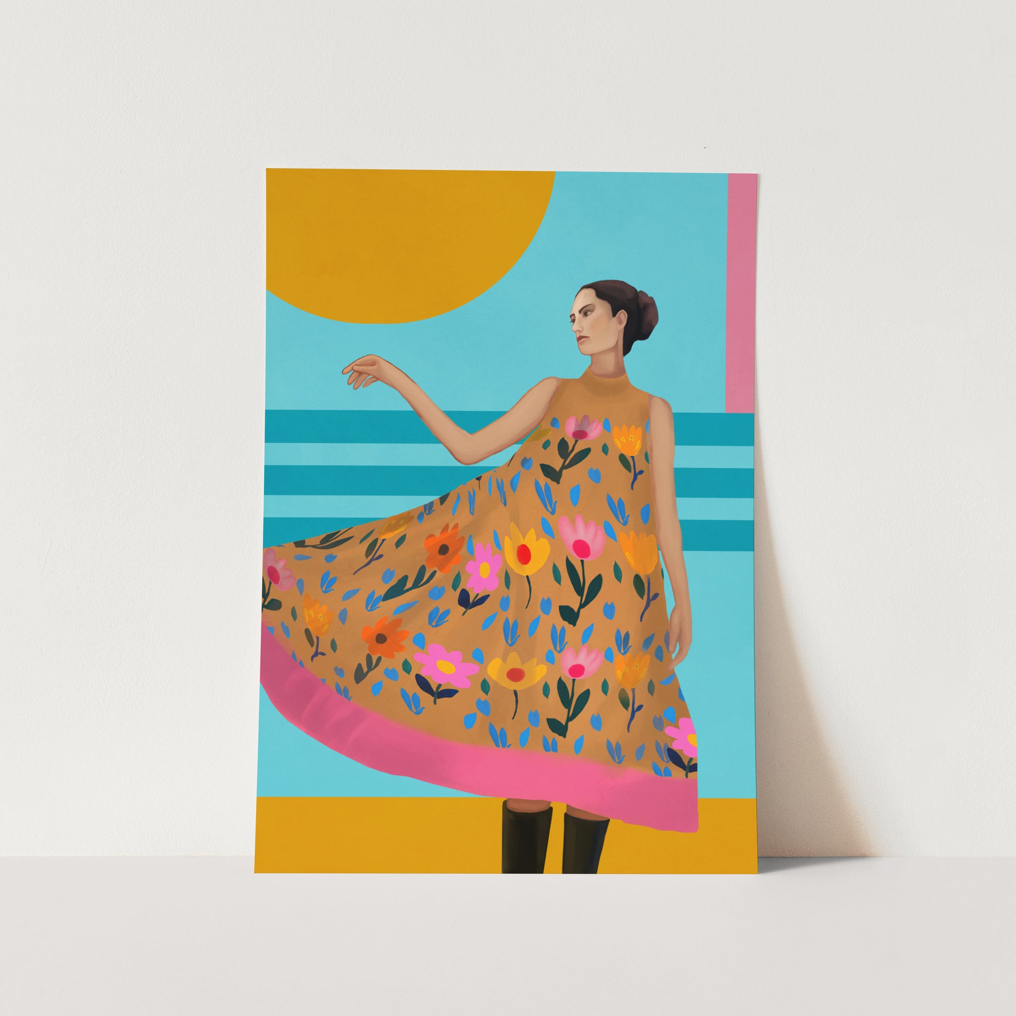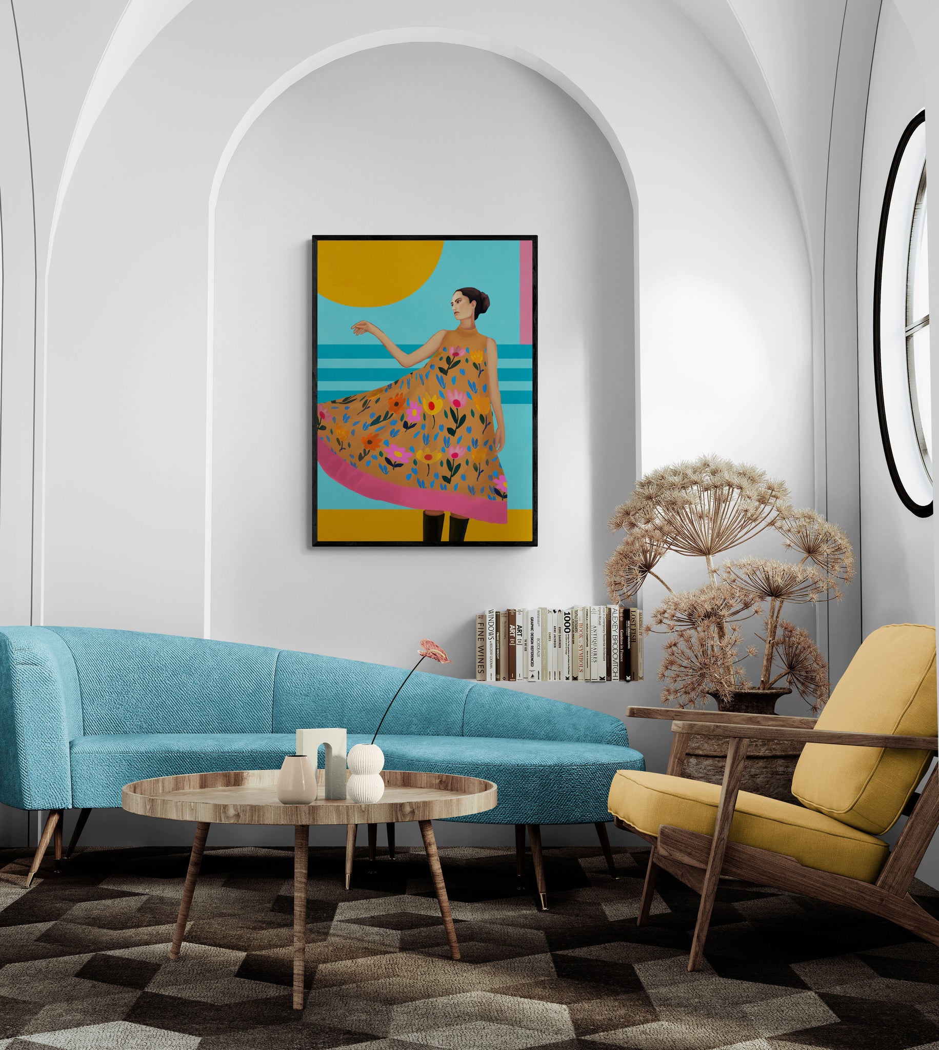 Celebrate vibrant elegance with the "Under The Sun" art print by Branka. Featuring a woman in a stunning orange and pink floral dress set against a striking geometric background, this piece brings warmth and dynamic energy to any space. Perfect for adding a touch of color and artistic flair, it transforms your walls into a captivating showcase of style and creativity.